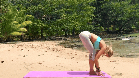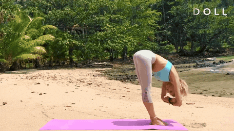 → 呼气:从髋关节折叠身体前屈,双手向前伸向脚尖。如果抓不到脚,抓小腿或脚踝