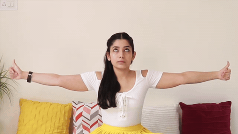 → 右臂向前伸直,拇指竖起,与眼睛同高。眼睛聚焦在拇指尖上