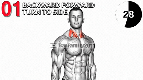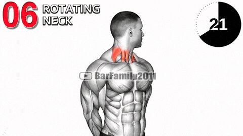 → 吸气回正,呼气时头部向右转,眼睛看向右肩后方,感受左侧颈部的拉伸。保持1秒后回正,换左侧
