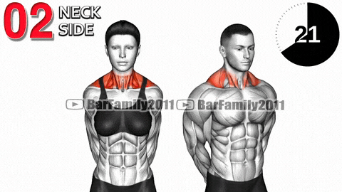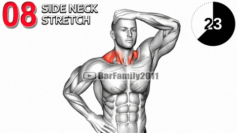 → 保持1秒,感受拉伸从耳后一直延伸到肩膀。吸气回正,换左侧