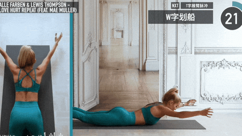 → 呼气时,肩胛骨向下沉并向中间靠拢,手肘沿着身体两侧向后拉,最终形成"W"字形