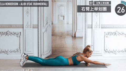 → 呼气时,保持手臂离地,在空中做小幅度的圆周运动:向上→向下→向上→回到起始