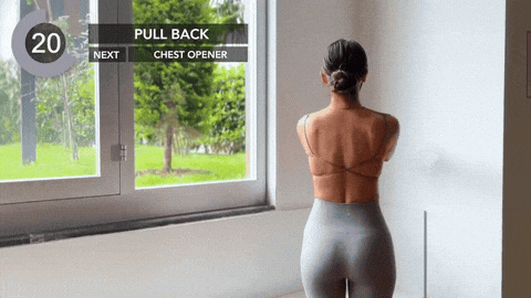 → 呼气时,双臂向后拉动,肩胛骨向中间收拢,胸口打开