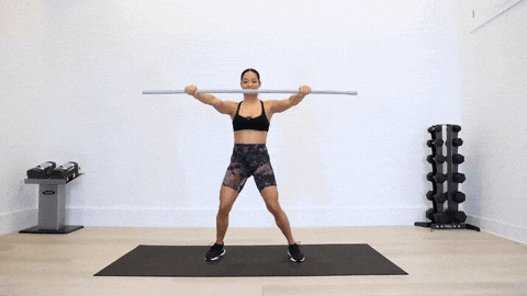 → 双手握住棍子两端,放在肩膀后方,像扛扁担