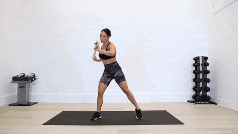 关键:旋转来自腰部,不是手臂在甩。髋部尽量保持朝前,只有上半身。想象用棍子"推墙",而不是轻飘飘地摆。这是侧腰训练的核心动作,能精准燃烧腰两侧脂肪