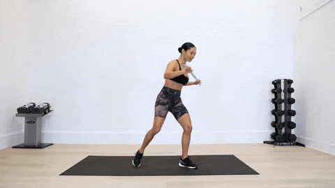 → 跳起时,双脚向外跳开至肩宽,同时双臂伸直,向前推杆