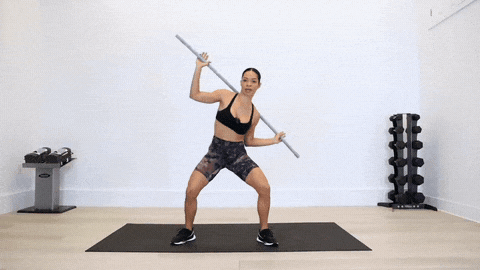 关键:棍子在肩膀后方,不要压在脖子上,不要前倾或后仰,是纯粹的"侧弯"。通过拉伸+收缩侧腰,塑造腰部曲线