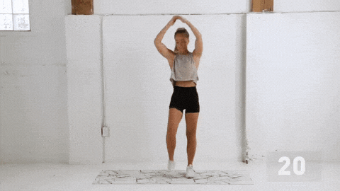 → 吸气时,双臂从身体两侧向上举起,双手叠握,举过头顶