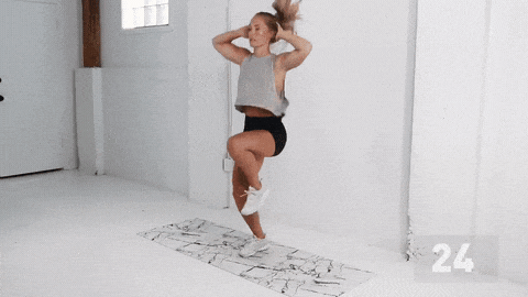→ 左右交替,保持身体垂直不前倾。如果站不稳,可以降低抬膝高度。