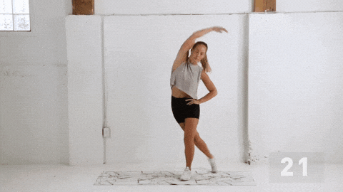 → 呼气时,抬起右腿,身体向右侧做侧屈。用手去触碰右侧膝盖,尽量让腿去找手