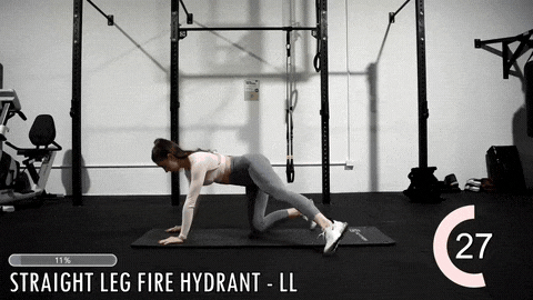 → 呼气时,以髋关节为轴,用臀外侧发力将伸直的腿向侧上方抬起