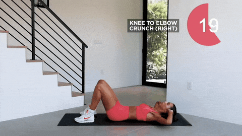 → 对侧手肘向该膝盖旋转靠近,同时另一条腿伸直前推