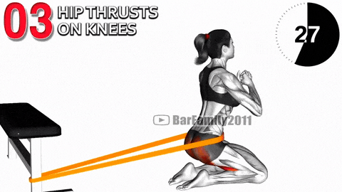 → 双膝跪地,与髋同宽。弹力带一端固定在前方低处,另一端绕在髋部。