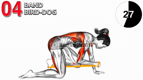 → 呼气时,同时向后伸直右腿、向前伸直左臂,对抗弹力带阻力。