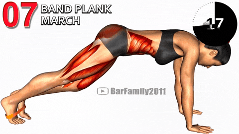 → 弹力带套在双脚脚背或脚踝。进入高位平板支撑