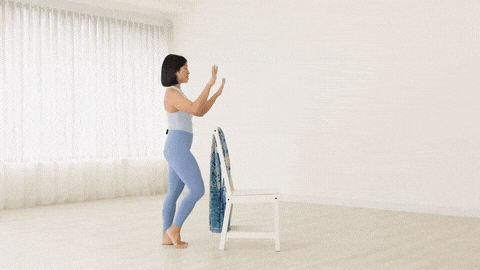 → 右臂向上伸直,左手放在椅子上辅助