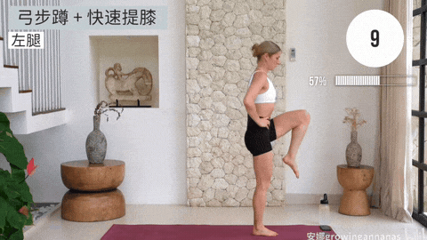 → 同时快速将左膝抬至胸部高度,形成单腿站立提膝姿势