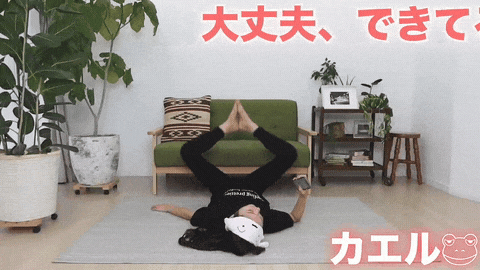 → 吸气准备,呼气时双膝同时弯曲,向胸部方向收,同时双膝向外打开,脚掌保持相对