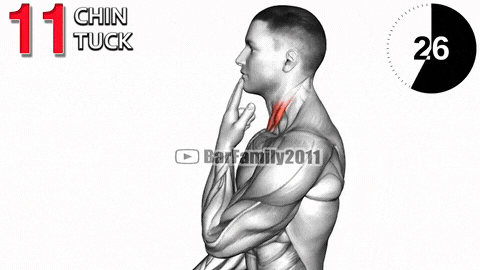 → 吸气准备,呼气时将下巴轻轻"向后缩",像要做出双下巴的动作。