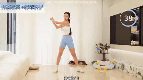 → 双脚分开1.5倍肩宽,保持半蹲姿势。双手模拟握高尔夫球杆,放在身体右侧