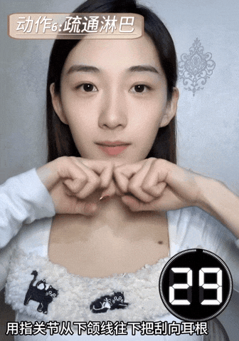 → 用手指关节从下巴中央,沿着下颌线向后"刮"到耳根下方