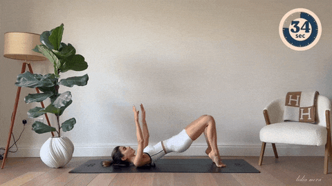 → 仰卧屈膝,双臂指向天花板。