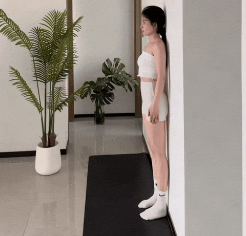 → 轻收下腹,让屁股自然贴近墙,不压紧。