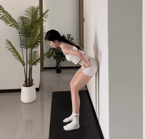→ 呼气时以髋关节为轴向前折叠,臀部向后轻推墙面
