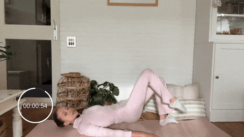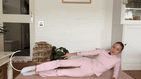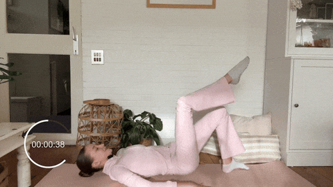 → 呼气时左腿画小圈,顺时针8圈。盆底持续收紧,髋不前倾后仰