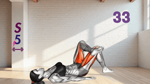 → 仰卧,右脚踝搭在左膝上成"4"字形。呼气用左脚跟发力抬起臀部