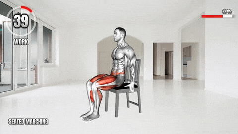 → 坐在椅子前端,背部挺直,双手轻放头后,核心收紧