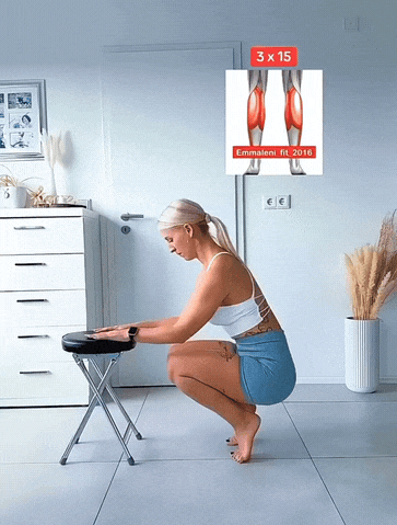 → 双手轻扶凳面,双脚与髋同宽。先下蹲到舒适深度,脚跟抬起用前脚掌支撑