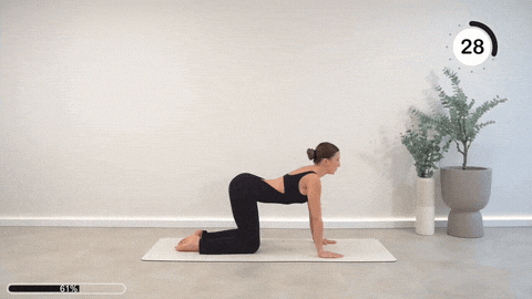 → 呼气尾骨内卷,肚脐上提,胸椎向上拱起,视线看向肚脐