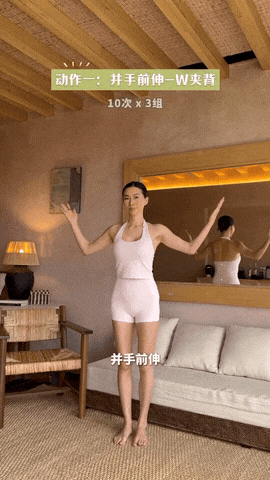 → 呼气时,屈肘向后拉,手肘贴近身体两侧,肩胛骨向脊柱靠拢。吸气还原。做12-15次→ 保持俯身姿势,双臂微屈。呼气时双臂向两侧打开至与肩同高,肩胛骨后收