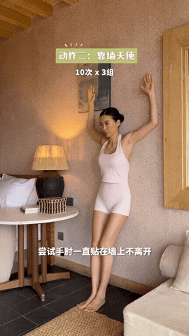 → 双臂抬起贴墙,手肘弯曲90度成"W"形。