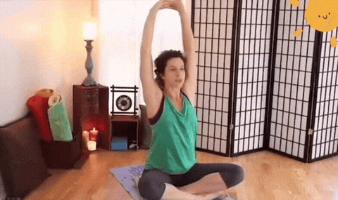 → 呼气,像推开一面墙一样伸展手臂,同时低头,下巴紧贴胸口。