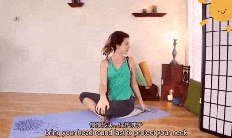 → 保持在这个角度深呼吸。你可以把手指点在地上缓慢移动,或者微微向下巴低头。每个人紧绷的位置不同,请根据身体反馈,在这里多停留一会儿。