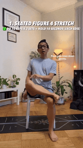 → 坐在椅子上,将一侧脚踝搭在另一侧膝盖上方,呈“4”字型,保持脊柱挺直。