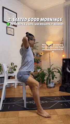 → 坐在椅子边缘,双腿向两侧尽量打开,双手交叉抱于脑后,核心收紧。