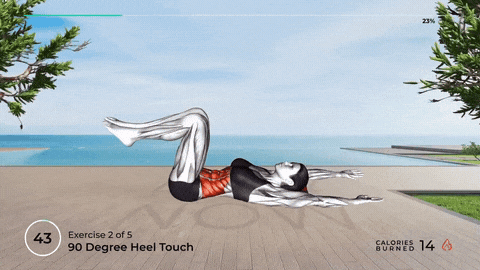→ 仰卧,双臂伸直举过头顶;双腿抬起90°,小腿平行地面。