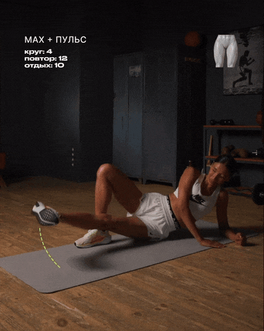 → 呼气将上方直腿从髋部外展抬起,并在最高点进行 1–3cm 的快速脉冲点动,锁定臀中肌。