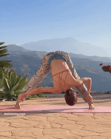 → 呼气双手向一侧扭转同时胸口向地面方向沉,颈部放松。