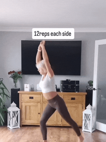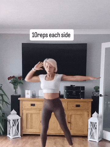 → 向左侧迈一大步,同时身体做侧向卷腹,让左肘朝右侧肋骨方向斜向靠近。