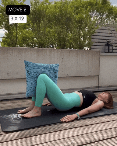 → 进入基础桥式,将枕头夹在双腿中间