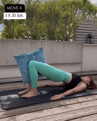 → 维持桥式高位,双膝均匀用力夹住枕头,双肩放松铺开,后颈拉长。