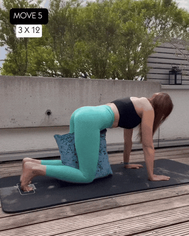 → 四点跪姿进入,背部平直如桌面,将枕头夹在腿中间,保持膝盖弯曲 90°。