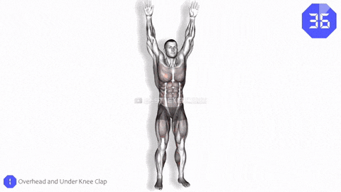 → 与此同时,双手从上方划弧线下落,在膝盖下方清脆拍手。