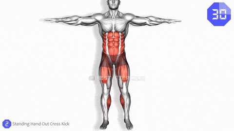 → 呼气时从髋关节启动,将一侧腿向身体斜前方踢出,对侧手顺势去触碰脚尖