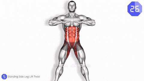 → 一侧腿向正旁侧抬起,同时上半身轻微向抬腿侧转动。