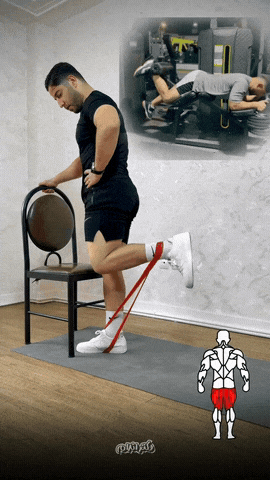 → 站在椅子旁扶稳,弹力带一端固定在脚下,另一端套在脚踝